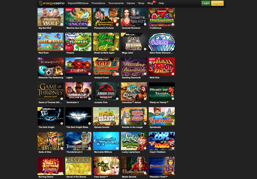 Niestety nie ma tu opcji Energy Casino na żywo. W niektórych kasynach mamy możliwość zagrania z prawdziwym krupierem. Możemy zobaczyć na przykład jak kręci on kołem od ruletki albo jak rozdaje nam karty. Niestety w tutaj nie ma takiej opcji. Ale za to kasyno jest skupione na oferowaniu rzadko spotykanych w internecie gier rodem z prawdziwych automatów, jakie tworzy ich główny dostawca – firma Novomatic. Na pewno Energy Casino casino jest niezwykłe właśnie dzięki grom, które oferuje. Należą do nich gry stołowe, videopoker, sloty oraz sloty z jackpotem, czyli ogromną kumulacją, której trafienie uczyni z ciebie milionera! Poza wspomnianą już Novomatic Group of Companies (71 gier kasyno ), znajdziemy tutaj też ofertę NetEnt (102 gry kasyno ) oraz Quickfire zasilane przez Microgaming (103 gry kasyno ). Łącznie aż 276 gier!